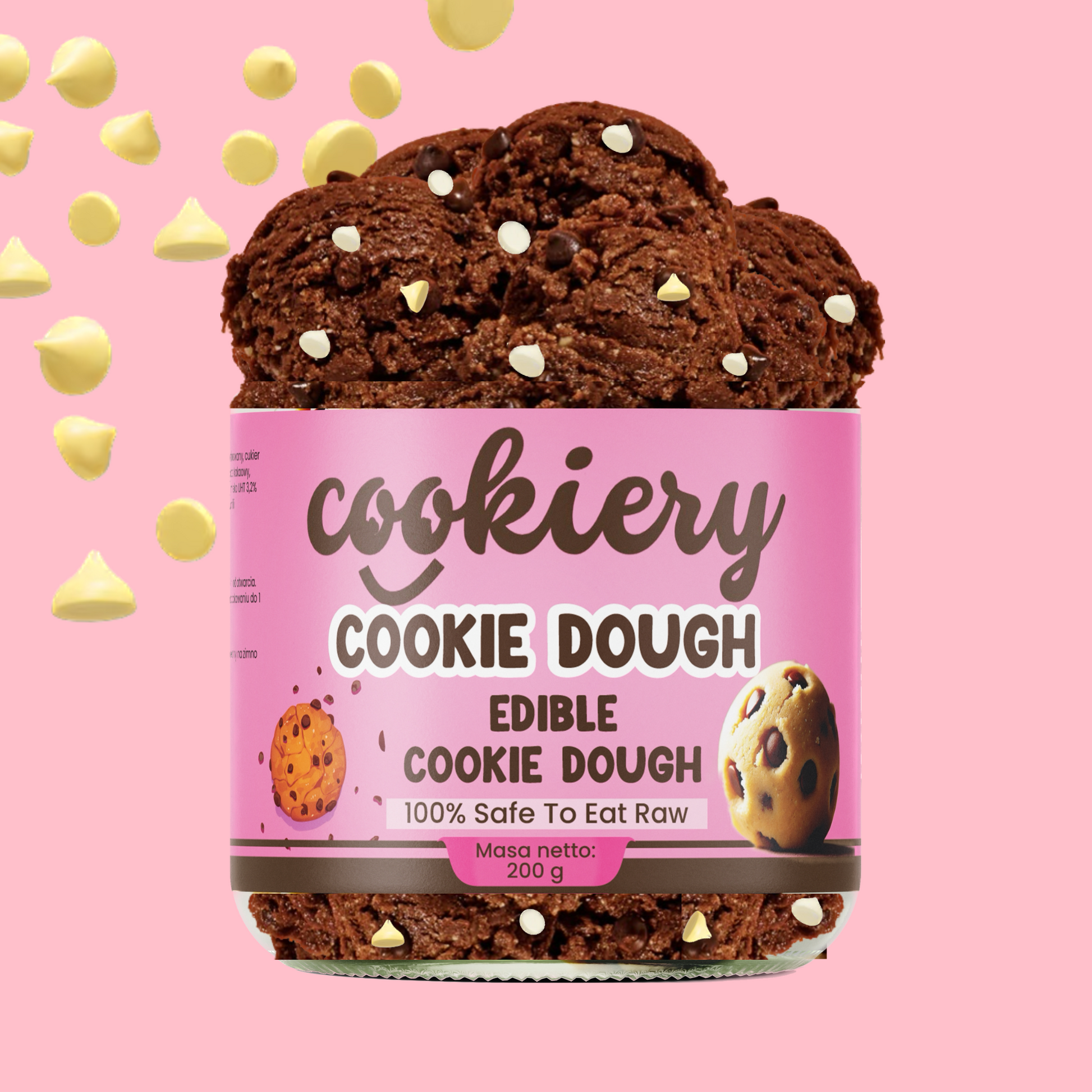 Dla prawdziwych czekoladoholików. To intensywnie czekoladowe ciasto cookie dough ma dodatek kakao w cieście i kawałki białej belgijskiej czekolady, które dodają kremowej słodyczy każdemu kęsowi. Bez jajek, z podgrzewaną mąką – w pełni bezpieczne do jedzenia na surowo.